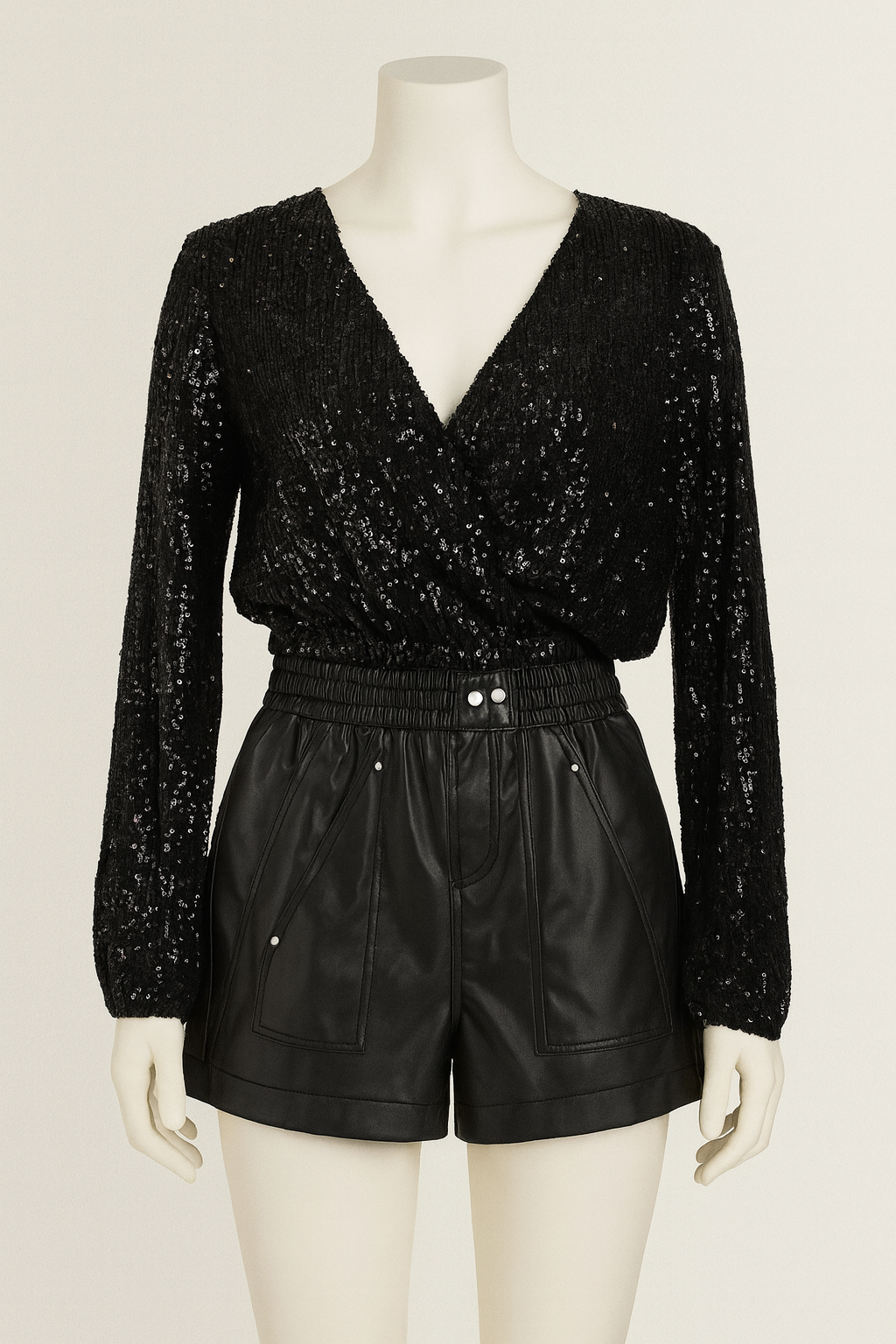 Pantaloncino corto ecopelle, tasche davanti e dietro, elastico in vita